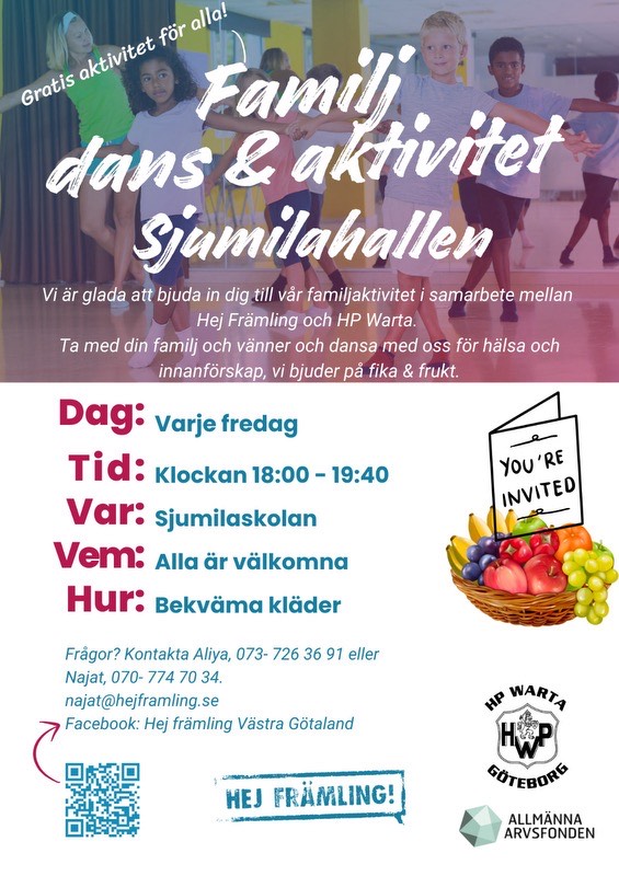 Välkommen till en glädjefylld familjeaktivitet med dans, rörelse och gemenskap! Varje fredag i Sjumilahallen – gratis för alla medlemmar. Kom som du är, i bekväma kläder. Arrangeras av Hej Främling och HP Warta.